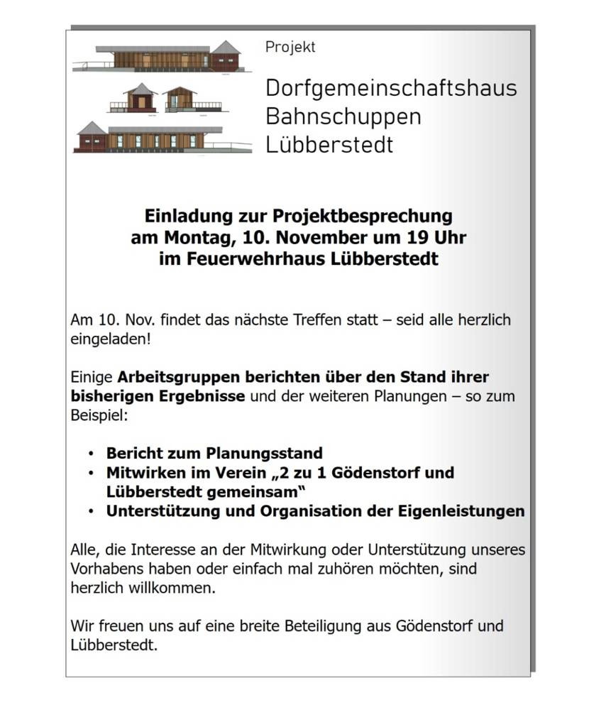 Anbei die Einladung zum nächsten Treffen für und im Bahnhofsschuppen Lübberstedt am Montag um 19 Uhr. Alle sind herzlich eingeladen.