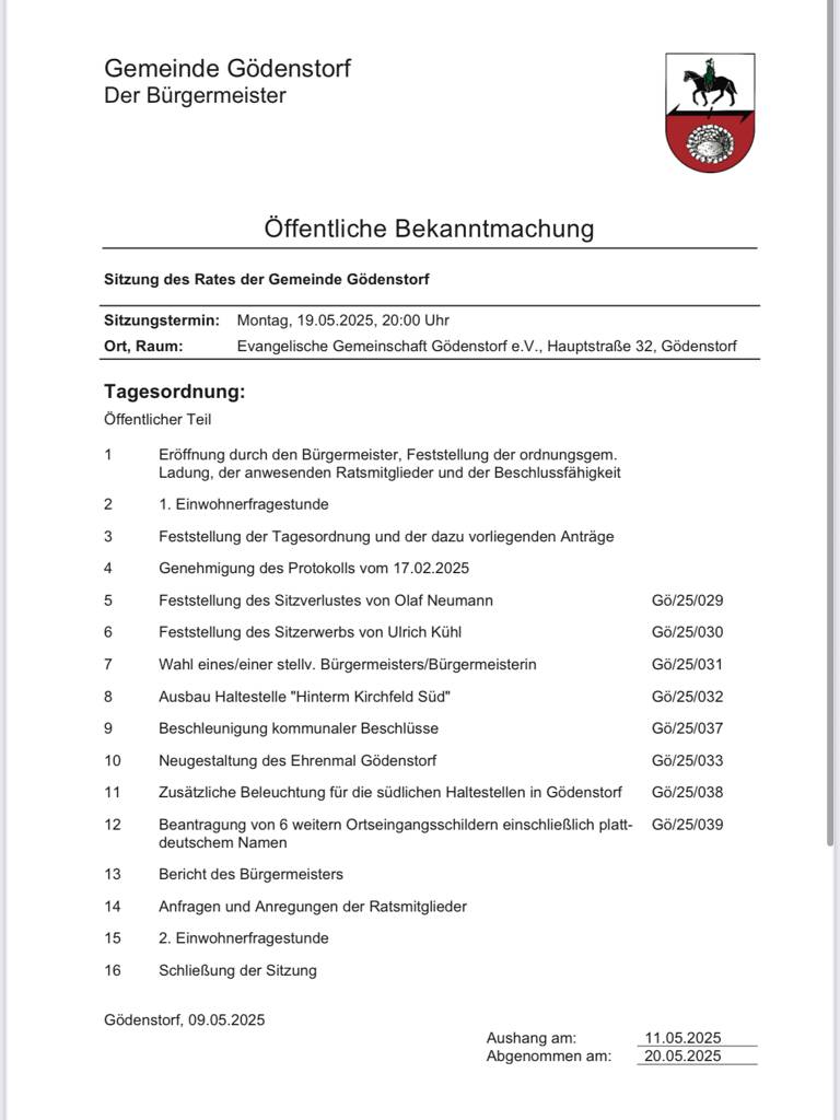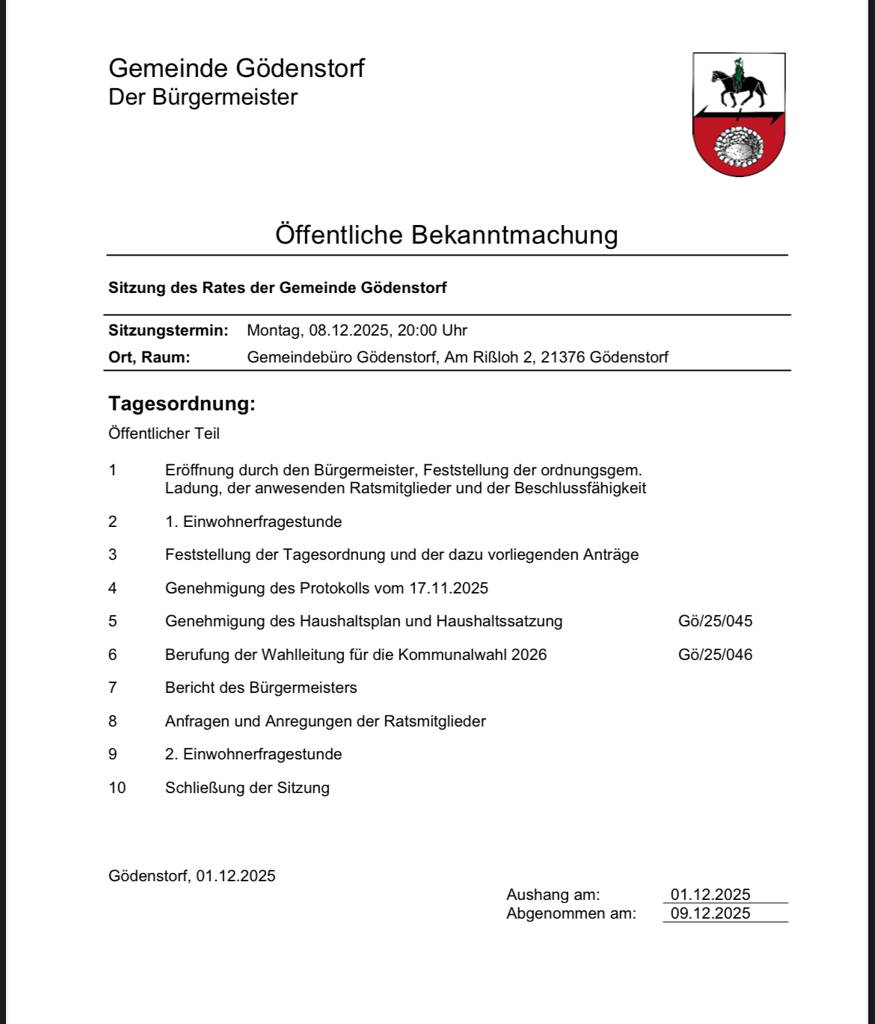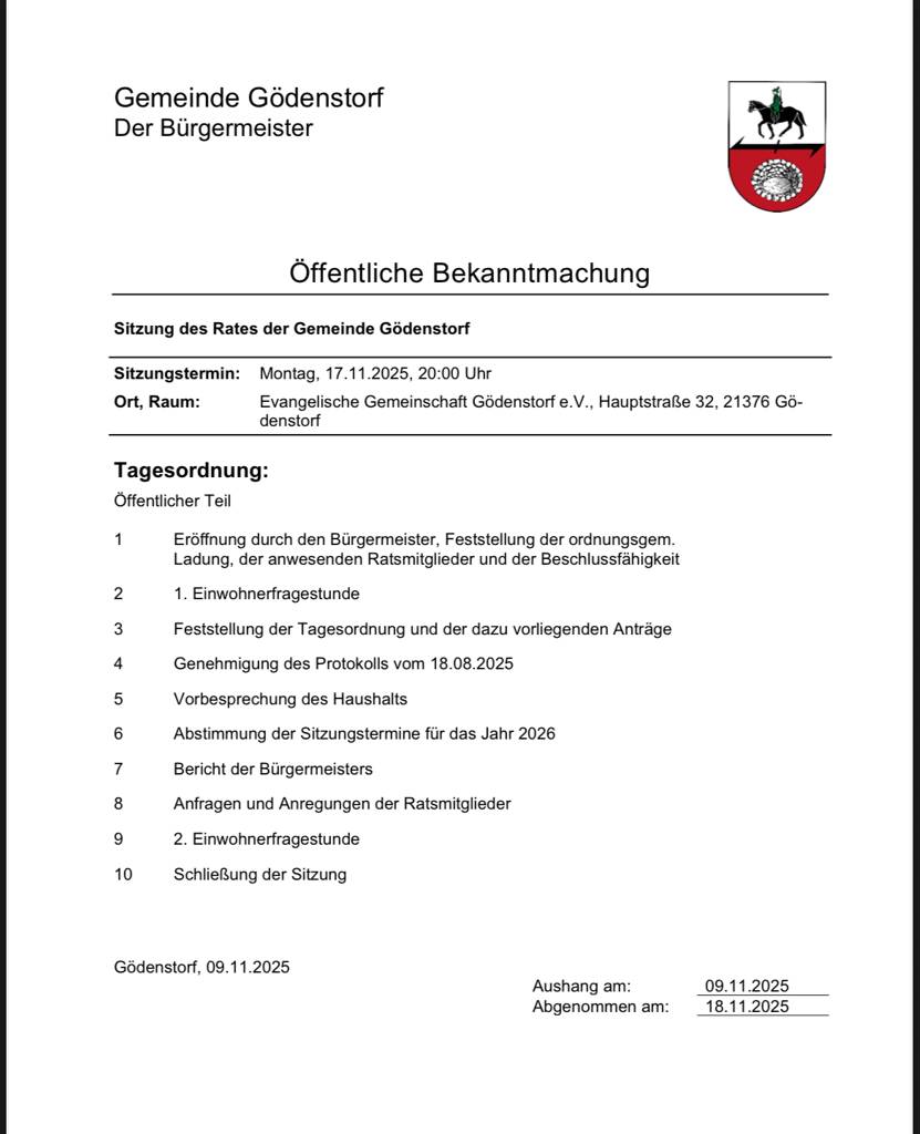 Die Sitzung findet am 17.11. um 20.00 Uhr in der Evangelischen Gemeinschaft statt. Nähere Infos siehe Bild.